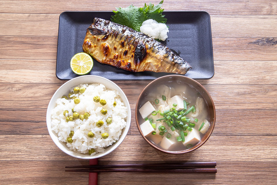 じゃじゃ~ん♪3品並べると鯖の塩焼き定食の完成です!!